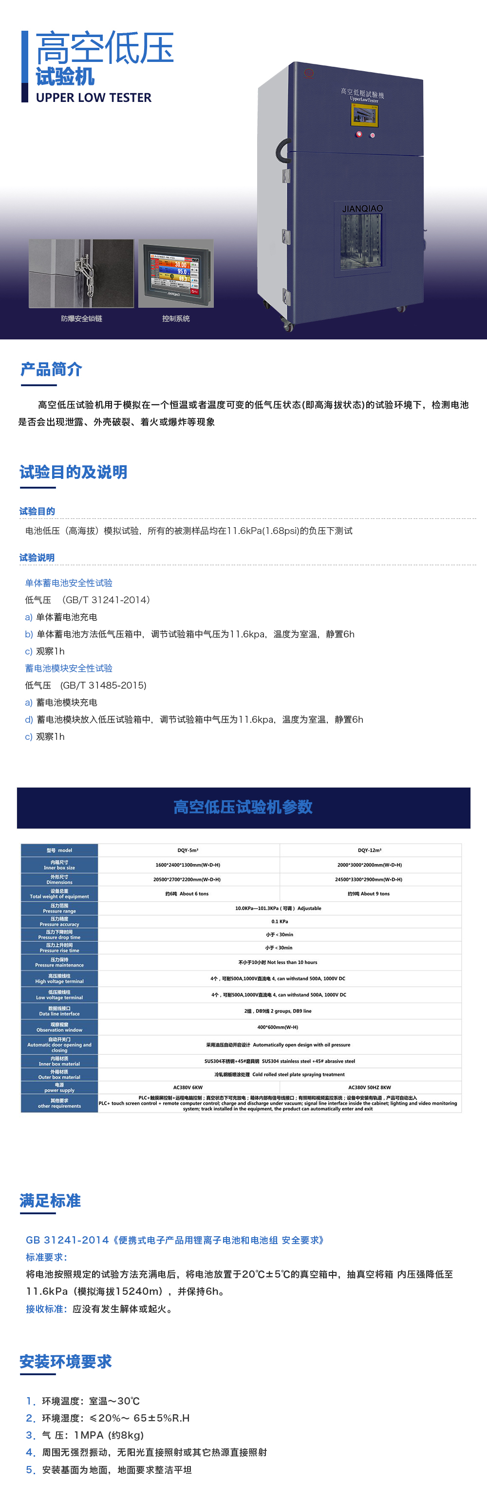 用途:高空低壓試驗(yàn)機(jī)用于模擬在一個(gè)恒溫或者溫度可變的低氣壓狀態(tài)(即高海拔狀態(tài))的試驗(yàn)環(huán)境下,檢測(cè)電池是否會(huì)出現(xiàn)泄露、外殼破裂、著火或爆炸等現(xiàn)象。