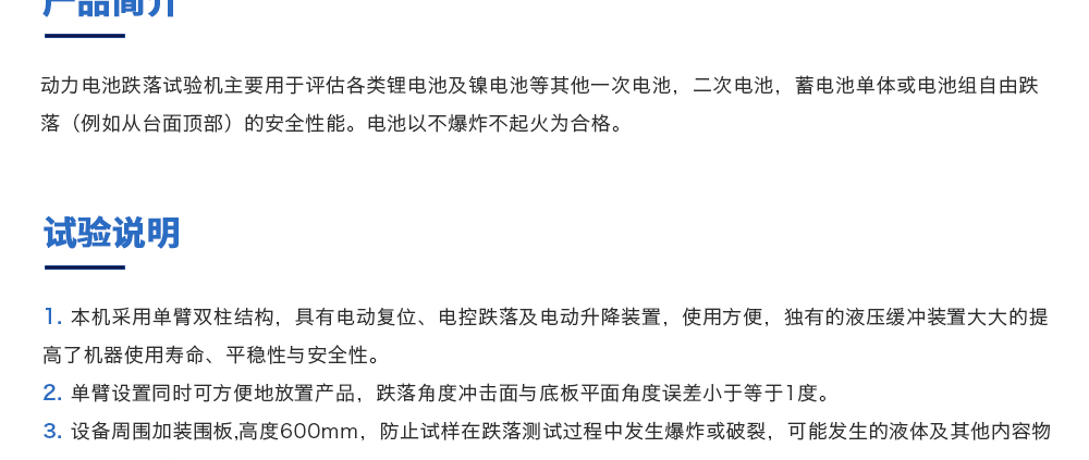 用途:動力電池跌落試驗(yàn)機(jī)主要用于評估各類鋰電池及鎳電池等其他一次電池,二次電池,蓄電池單體或電池組自由跌落(例如從臺面頂部)的安全性能。電池以不爆炸不起火為合格。