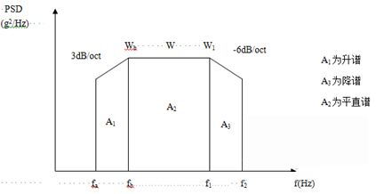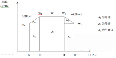 為了簡(jiǎn)便起見,往往將功率譜密度曲線圖劃分成若干矩形和三角形,并利用上升斜率(如3dB/oct)和下降斜率(如-6dB/oct)分別算出wa 和w2,然后求各個(gè)幾何形狀的面積與面積和,再開方求出加速度總均方根值。