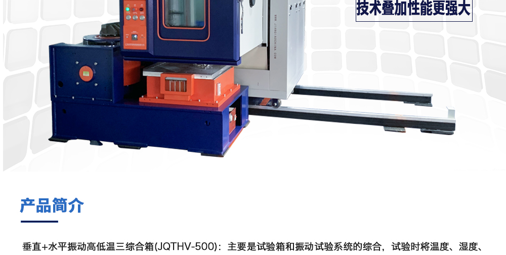 用途:垂直+水平振動高低溫三綜合箱(JQTHV-500):主要是試驗箱和振動試驗系統(tǒng)的綜合,試驗時將溫度、濕度、振動(高溫或低溫),(正弦振動或隨機振動)以及電應(yīng)力按規(guī)定的周期綜合在同一氣候試驗箱中施加到樣品上進行溫度、濕度、振動的“環(huán)境仿真”試驗。