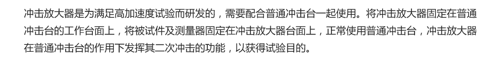 用途:沖擊放大器是為滿足高加速度試驗(yàn)而研發(fā)的,需要配合普通沖擊臺一起使用。