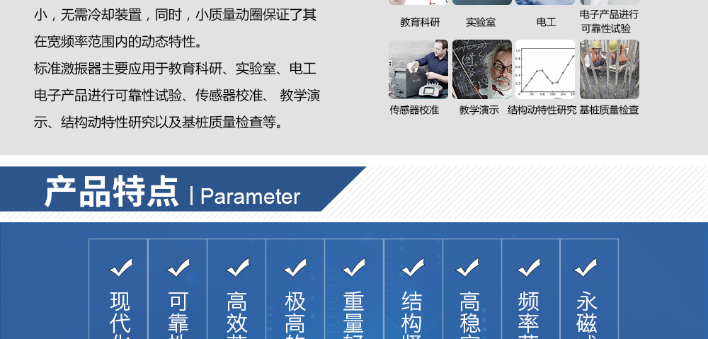 用途:標(biāo)準(zhǔn)激振器是利用永久磁鋼形成靜態(tài)磁場(chǎng),不需要額外的勵(lì)磁電源,簡(jiǎn)化了對(duì)功率放大器的要求,發(fā)熱量小,無需冷卻裝置,同時(shí),小質(zhì)量動(dòng)圈保證了其在寬頻率范圍內(nèi)的動(dòng)態(tài)特性。標(biāo)